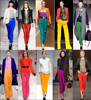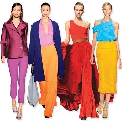 • Fashion is moving away from minimalism: find striking shades like electric blue, deep red, saffron yellow, and neon green, combined with pastel hues.